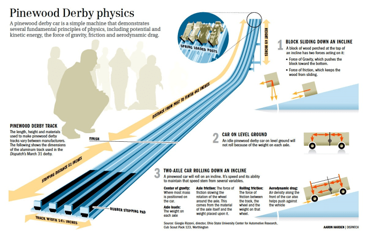 The track usually has two to eight lanes and slopes down to the ground, since the cars are powered by gravity. The race is run in heats, giving every car the chance to run on each lane. The racers are grouped with others from the same rank (Lion, Tiger, Wolf, Bear, WEBELOS, and Arrow of Light).